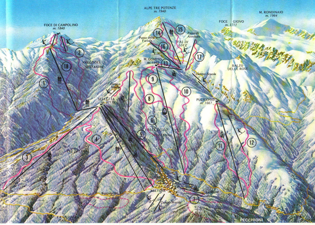 Cinque piste da sci servivano il comprensorio; d’inverno e d’estate, prendendo i tre tronchi della cabinovia (costruita dall’azienda Graffer di Trento all’inizio degli anni Sessanta), dall’Abetone si poteva salire alla Selletta, scendere in val Sestaione e quindi risalire alla Foce di Campolino, punto di partenza di numerosi sentieri e itinerari escursionistici sul crinale della montagna, verso il Poggione o verso il lago Nero e il lago Piatto.