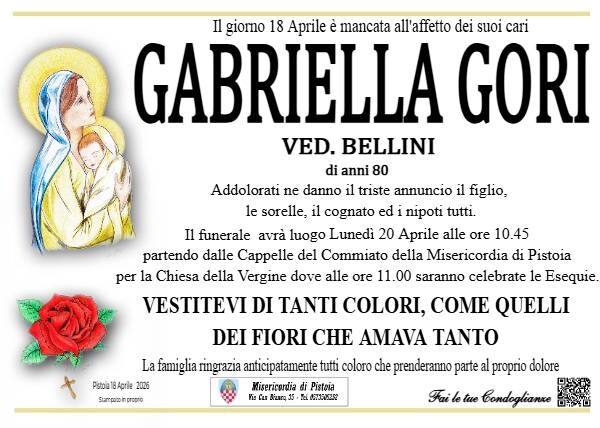 HomeNECRO Gabriella Gori di Redazione 18 Aprile 2026 0 144 FacebookTwitterPinterestWhatsApp Condividi FacebookTwitterPinterestWhatsApp PrecedenteRamini. La protesta dei residenti contro don BiancalaniProssimoCarmignano. Sicurezza idraulica: il punto sui lavori Redazione Related Articles PISTOIA Guerra e lavoro, incontro di Pistoia rossa al circolo Le Fornaci TOSCANA Truffe ad anziani, arrestato finto carabiniere col bottino a Livorno PIANA Rinnovato il Consiglio di Panathlon Pistoia Montecatini Rispondi Cancella risposta Commento: Inserisci il tuo commento Nome:* Inserisci il tuo nome Email:* Indirixzo email sbagliato Inserisci la tua email Sito web: Save my name, email, and website in this browser for the next time I comment. ULTIMI ARTICOLI PISTOIA Guerra e lavoro, incontro di Pistoia rossa al circolo Le Fornaci TOSCANA Truffe ad anziani, arrestato finto carabiniere col bottino a Livorno PIANA Rinnovato il Consiglio di Panathlon Pistoia Montecatini PRATO Banchelli presenta ‘Prato insieme’: “dieci anni di malgoverno hanno messo in ginocchio Prato” LE STRADE DEL GUSTO Vininsala, una nona edizione ancora più estesa con un focus sui vini artigianali Carica altro