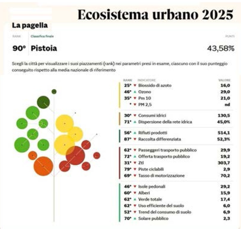 Tornando agli ecosistemi urbani, esistono molti modi per misurarne il grado di efficienza mediante la valutazione di una serie di parametri relativi al consumo di risorse, al grado di inquinamento, ai vari tipi di mobilità più o meno dolce, ecc. Legambiente, insieme al Sole 24ore, periodicamente stila una classifica delle città di capoluogo italiane e negli ultimi anni abbiamo assistito a un progressivo arretramento di Pistoia, oggi nelle retrovie a livello nazionale, non solo regionale.