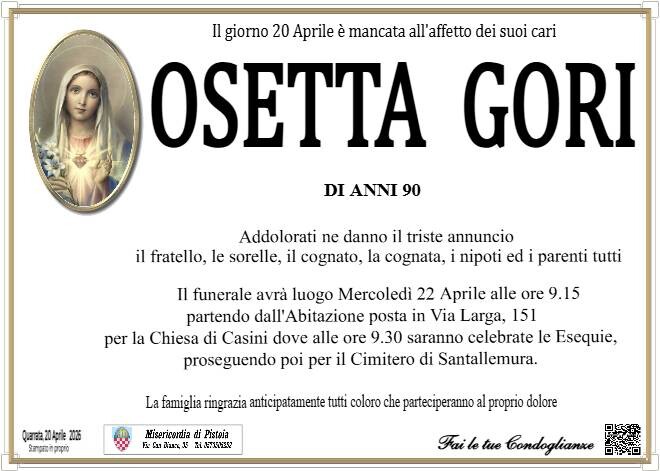 HomeNECRO Osetta Gori di Redazione 20 Aprile 2026 0 239 FacebookTwitterPinterestWhatsApp Condividi FacebookTwitterPinterestWhatsApp PrecedenteFormazione infermieristica a Firenze e Pistoia: otto i corsi di maggioProssimoIl Vescovo Nerbini saluta il nuovo Vescovo di Pistoia e Pescia Redazione Related Articles TOSCANA Arezzo, muore travolto dal trattorino che si ribalta TOSCANA Confindustria Toscana Nord: eletti Consiglio generale e i Consigli di sezione VALDINIEVOLE Lavoratore cade da una impalcatura a Larciano, portato al CTO da Pegaso Rispondi Cancella risposta Commento: Inserisci il tuo commento Nome:* Inserisci il tuo nome Email:* Indirixzo email sbagliato Inserisci la tua email Sito web: Save my name, email, and website in this browser for the next time I comment. ULTIMI ARTICOLI TOSCANA Arezzo, muore travolto dal trattorino che si ribalta TOSCANA Confindustria Toscana Nord: eletti Consiglio generale e i Consigli di sezione VALDINIEVOLE Lavoratore cade da una impalcatura a Larciano, portato al CTO da Pegaso MONTAGNA Torna a inizio maggio l’anteprima del Toscana Django Festival PISTOIA Pattinaggio artistico a rotelle, Benedetta Bindi convocata in World Cup Carica altro